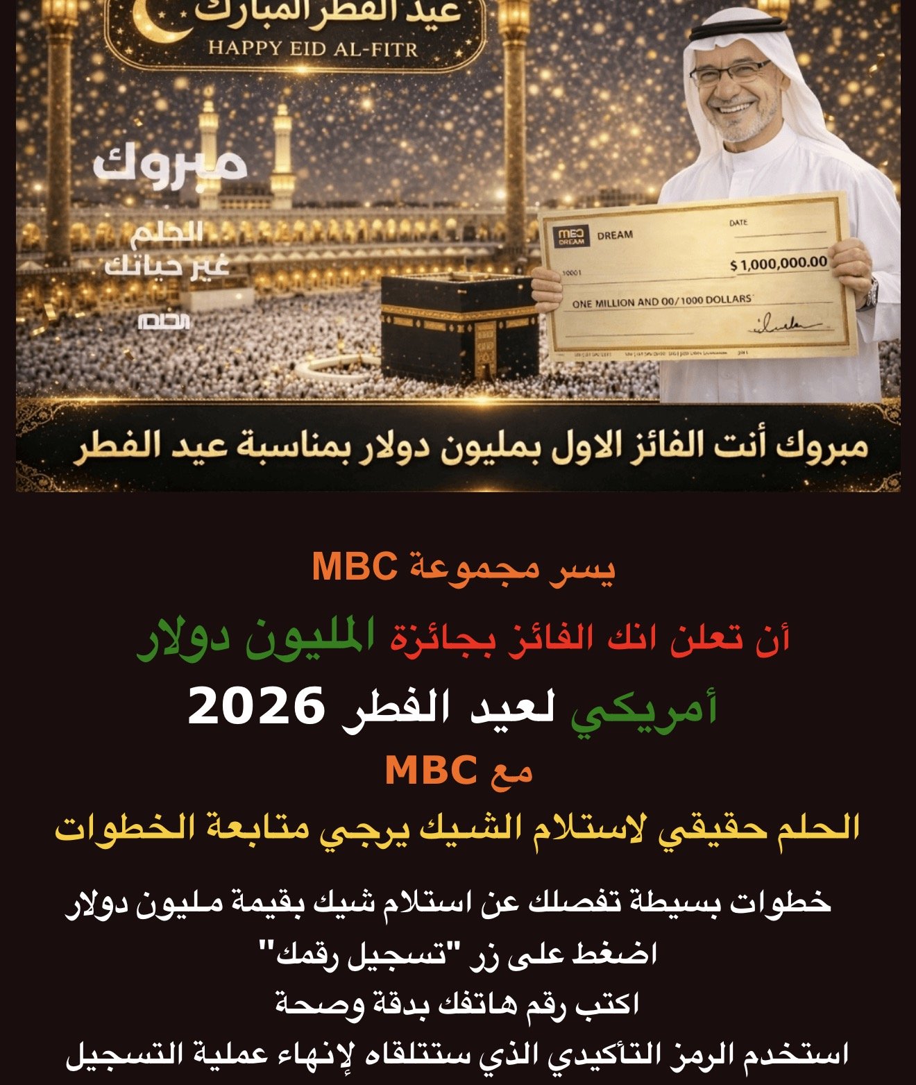 "يا جماعة الخير، لو ما شفت بعيني ما كنت هصدق. استلمت الشيك فعلاً والحلم بقى حقيقة. MBC، أنتم أفضل ما صار لي في حياتي!" .